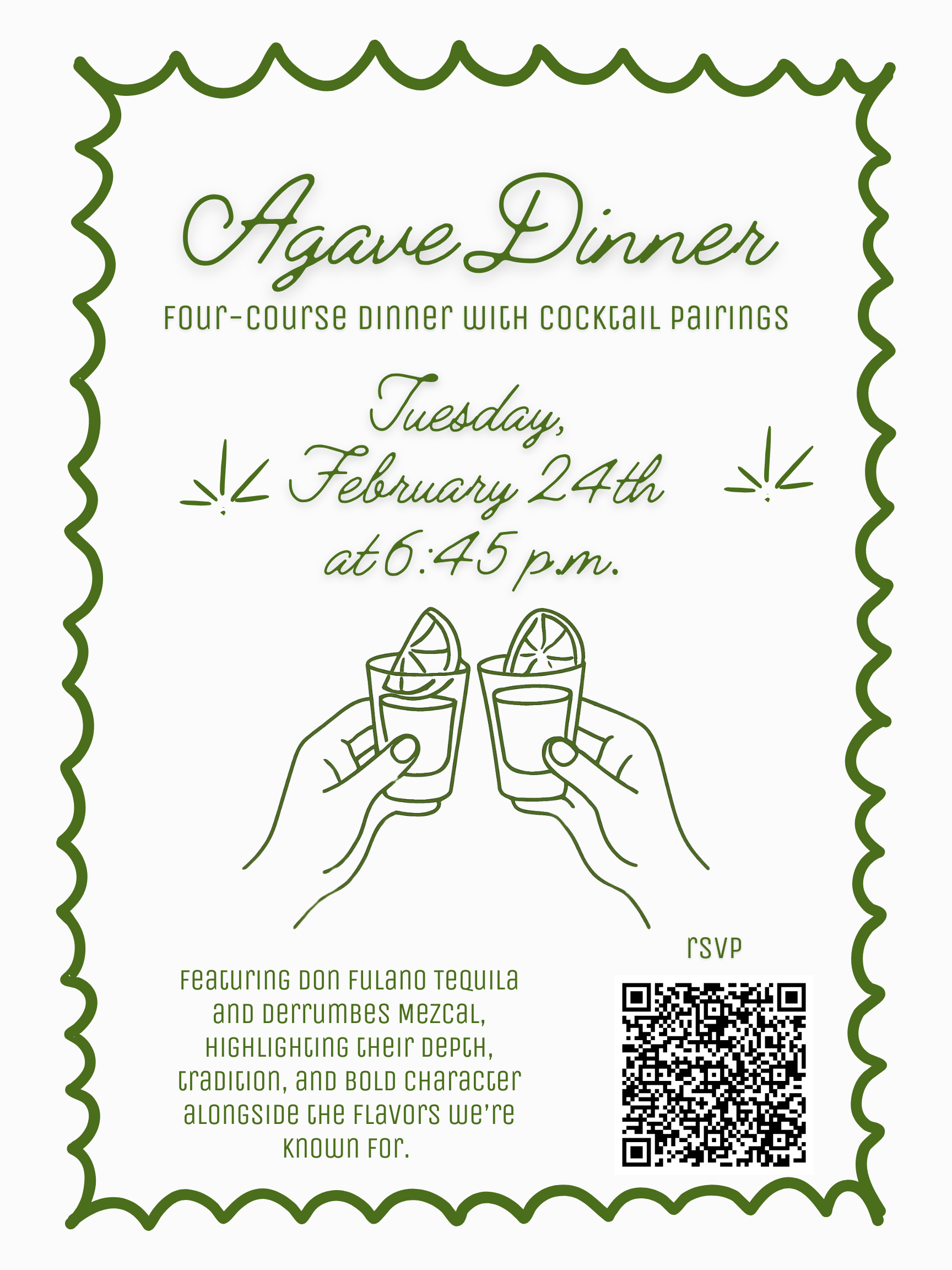 Join us for an intimate four-course dining experience celebrating the rich, complex world of agave spirits. Each course is thoughtfully paired with selections featuring Don Fulano Tequila and Derrumbes Mezcal, highlighting their depth, tradition, and bold character alongside the flavors we’re known for. An evening of exceptional food, expertly crafted spirits, and unforgettable pairings awaits.